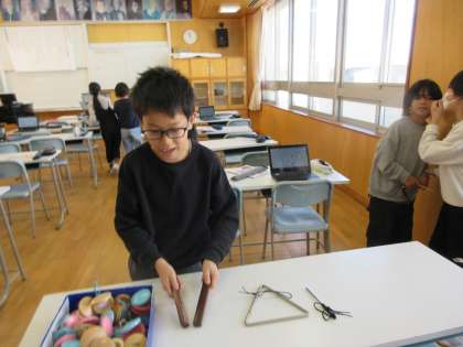 いろいろな打楽器を鳴らし、音の特徴を見つけました。響き方や音の高さの特徴をクロムブックに記録し、分類しました。