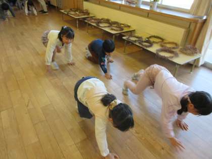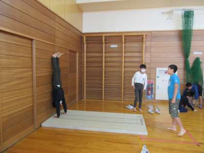 1年生は動物歩き、6年生はマット検定の練習です。友達や先生にアドバイスをしてもらいながら練習し、レベル達成を目指します。