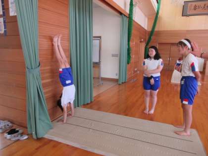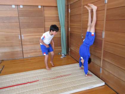マットの練習です。金レベルに向けて、友達とアドバイスをし合いながら、技の上達を目指しています。