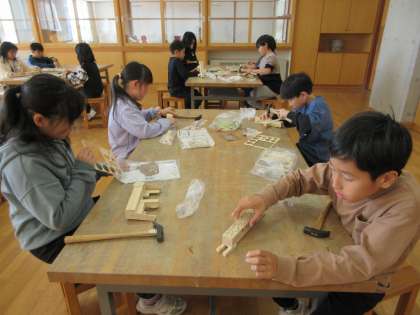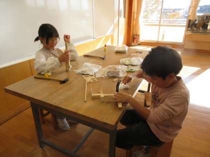 金づちとくぎ、木材を使って作品を作っています。くぎの特徴を生かして動物を作ったり、風車を作ったりと、想像を膨らませて取り組んでいます。
