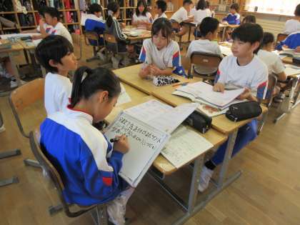 分数の問題を解くときに気を付けることを考えたり、自分で考えた問題を出し合ったりして、グループ学習に取り組みました。