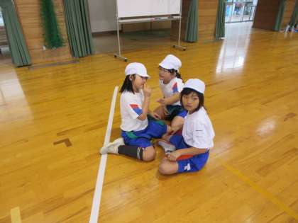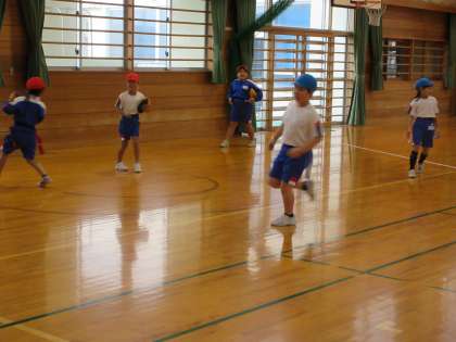 タグラグビーをしています。チームで作戦を立てて、1点でも多く取れるよう工夫しました。ゲーム中も、仲間に「こっちだよ!」と声をかけていました。負けたチームも終わった後は「楽しかったー」と満足そうでした。