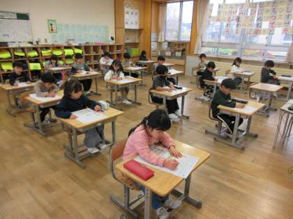 単元テストをしました。鉛筆の持ち方に気を付けて、丁寧に取り組みました。