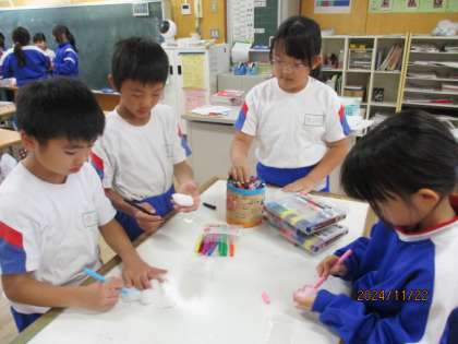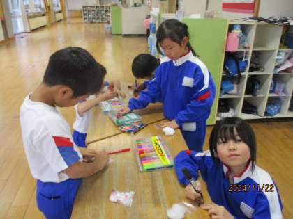 今日は、スクイーズ係の提案で、みんなでスクイーズ作りをしました。ミニビニール袋に絵を描き、中に入れる綿にも色をつけ、触って気持ちよい、見てかわいいスクイーズをみんなで作り、楽しみました。