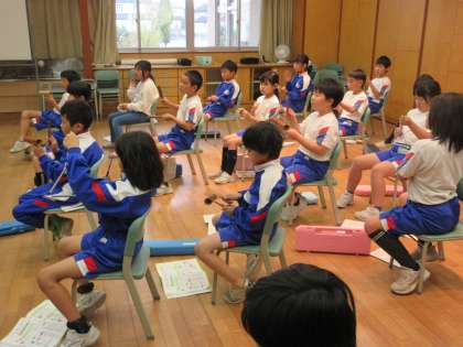 みんなでリズムを考え、自分で選んだ打楽器でリズム打ちをしました。休符のところは「ウン!」と数えて意識しました。