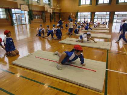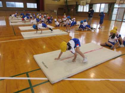 今日は技7のマット検定です。各学年のレベルの技に挑戦し、金スターを目指しました。これまでの練習の成果が表れたようです。