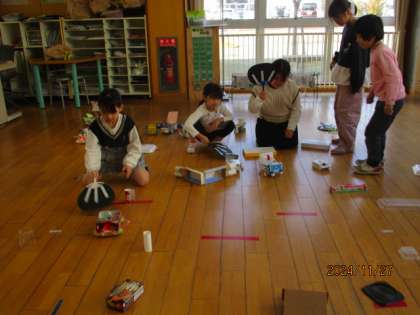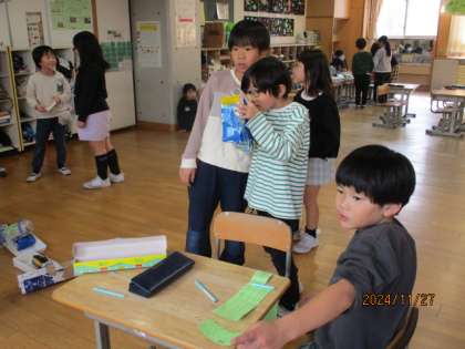 2年生全員で、作ったおもちゃで遊びました。隣のクラスのおもちゃコーナーに嬉しそうに駆け寄る姿や、遊び方を教えて応援する姿があり、たくさんの笑顔があふれていました。