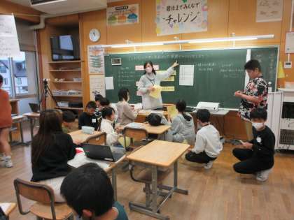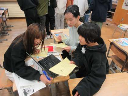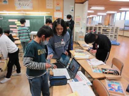 「At a restaurant」の学習です。グループごとに決めたメニューをスライドにのせ、店員と客に分かれて英語でコミュニケーションをとりました。値段や味も英語で言えるようになってきています。