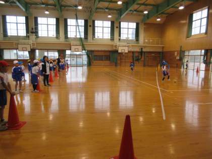 ボールを蹴りながらリレーをしました。思ったところにボールを転がすのが難しそうでしたが、少しずつ上手になってきています。