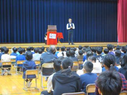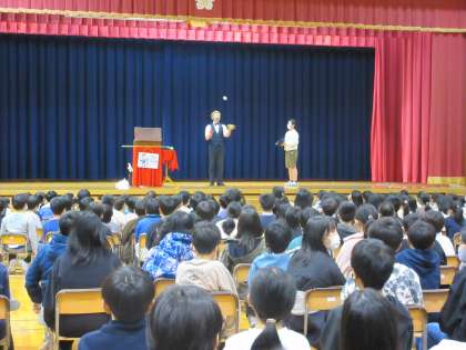 大道芸パフォーマーのハルキさんに、大道芸パフォーマンスを披露していただきました。テレビや動画で見るものとは違い、本物の手品やジャグリングを見て、子供たちは心を動かしていたようです。