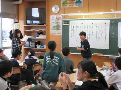 漢字のたしかめです。一人ずつ前に出て答えを書きました。分からない漢字があっても、友達が優しくヒントを出していました。