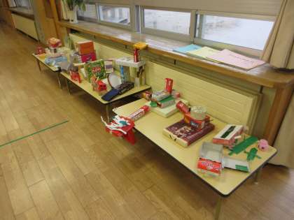 1年生フロアには、身近にある箱で作った作品が飾られています。どの作品も工夫がいっぱいです。