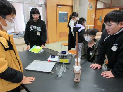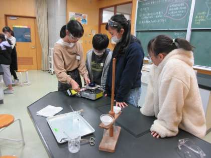 水溶液から食塩とミョウバンを取り出す実験です。蒸発皿に入れた水溶液を加熱し、どのように変化していくのかを興味津々で見ている子供たちでした。