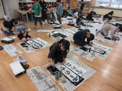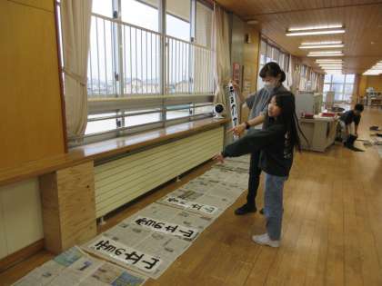 「雪の立山」の4文字のバランスを考えながら練習しました。名前の位置も大切です。先生からアドバイスをもらい、熱心に取り組みました。