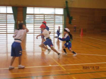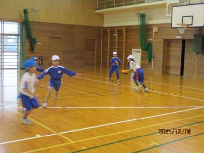 団対抗でボール運びゲームをしています。1点でも多く取るために、それぞれの団で作戦を立てて取り組んでいます。団のみんなで協力することや、助け合うことを一緒に学んでいます。