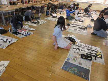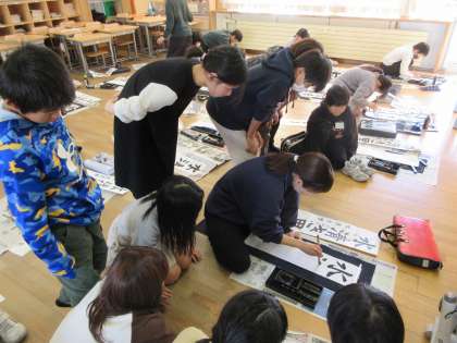 書初めの練習をしています。先生の筆の動きをよく見て学習に生かします。