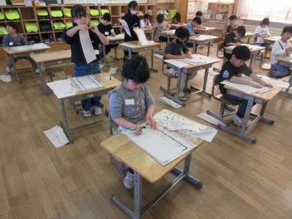 硬筆墨で書初めの練習をしています。1年生にとっては、初めての書初めです。今日練習したものは、家に持ち帰って家族に見てもらうそうです。