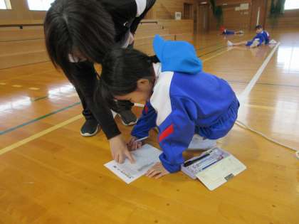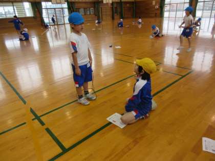 縄跳びの練習をしています。友達に跳べた回数を数えてもらい、縄跳びカードに記録します。「先生、○回跳べたよ!」と嬉しそうに報告してくれました。