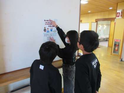 これまで総合の時間に調べてきたことを、いよいよ実践していきます。クイズラリーチームは、楽しく環境について学んでもらおうと、校内にクイズを掲示していました。