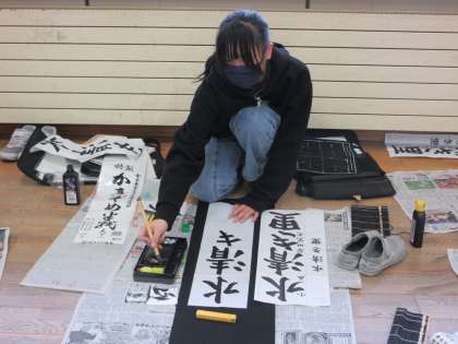 書初めの練習です。最後まで集中を切らさず練習する子供の姿も見られました。