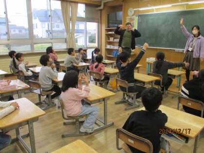今日は、3年生から始まる英語の授業を体験しました。ALTの先生の発音に続いて英単語を言ったり、一緒にゲームをしたりして英語を楽しみました。