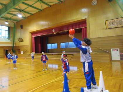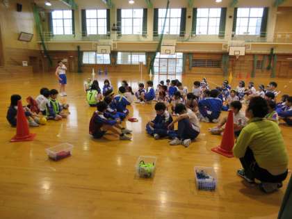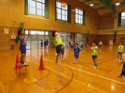 ポートボールです。周りを見て動いたり、仲間に合図を送ったりして、チームワークが向上しています。