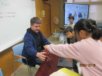 昨日の英語の授業のお礼に、さつまいものつるで作ったリースをALTの先生に渡しました。