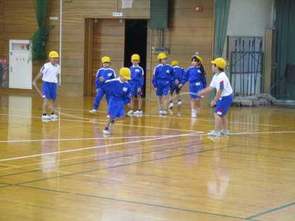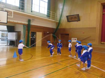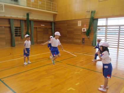 体育の時間に、長なわとびの練習をしています。リズムよく縄の下をくぐったり、縄を跳んだりしました。はじめはうまく跳べない人もいましたが、何回も練習をして、タイミングよく跳べるようになってきました。