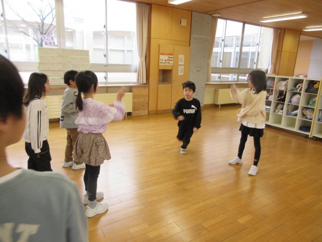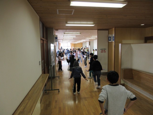 冬の体力つくりは、鉄棒と縄跳びです。2、3年生フロアでは、短縄と長縄の練習をがんばっています。