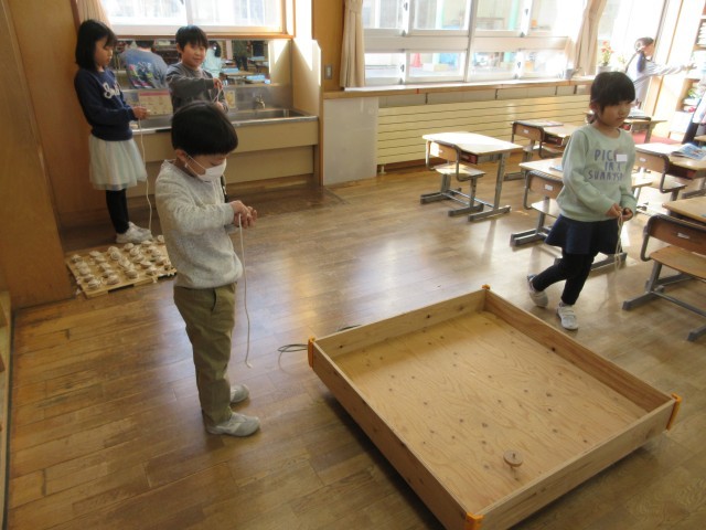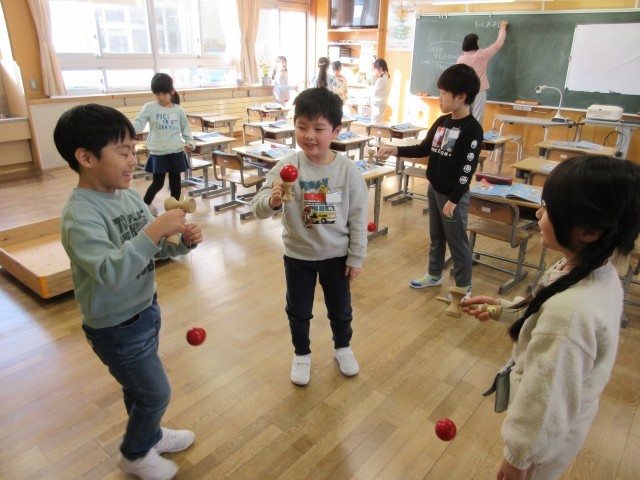 けん玉やこま回しの練習をしました。友達と見合うことで、さらに上達しているようです。