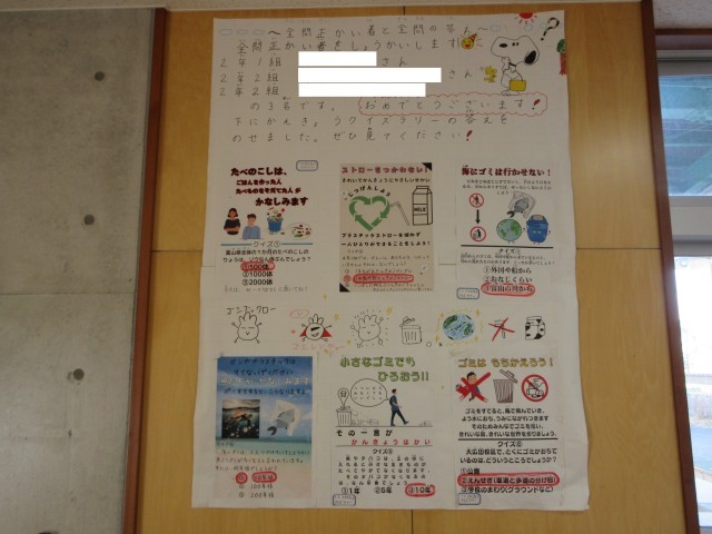 2学期に行った環境クイズラリーの答えと結果が掲示されています。下学年も、環境について関心をもち始めています。