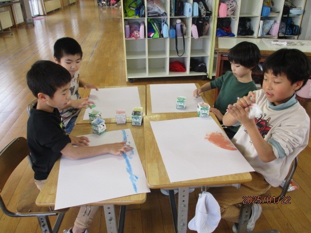 今日は、液体粘土を使って、とろとろした絵の具を作り、指や手を使って画用紙に絵を描きました。