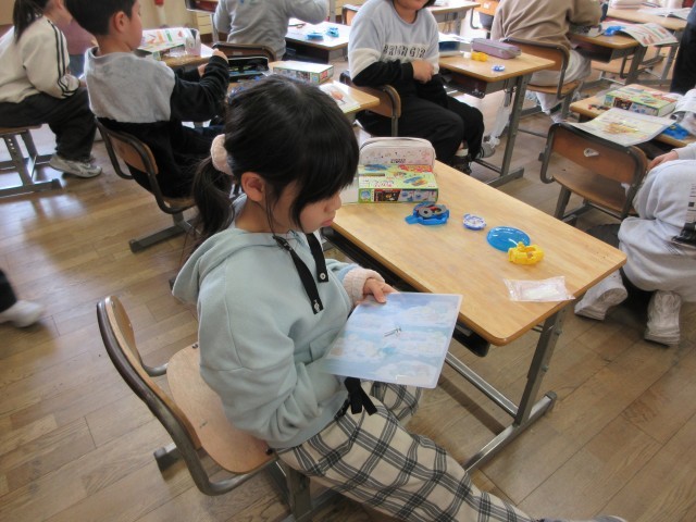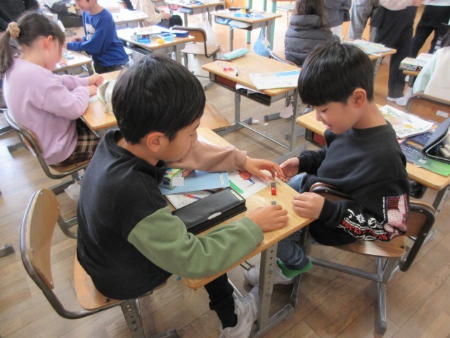 磁石を使って、磁石の性質を調べています。下敷きを挟んだら磁石の性質はどうなるのか、磁石をつなげたら強さはどうなるのかなど、様々なことを試していました。