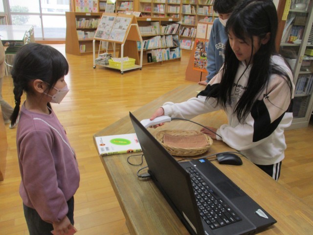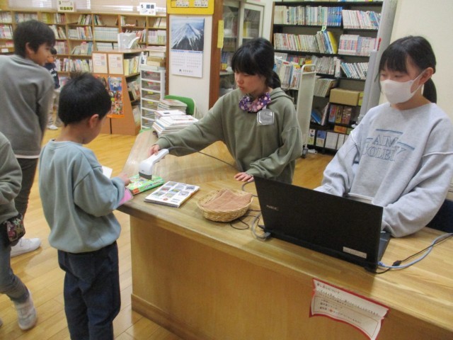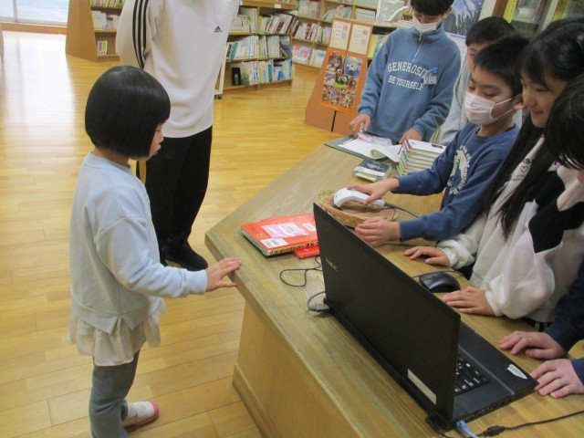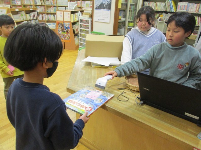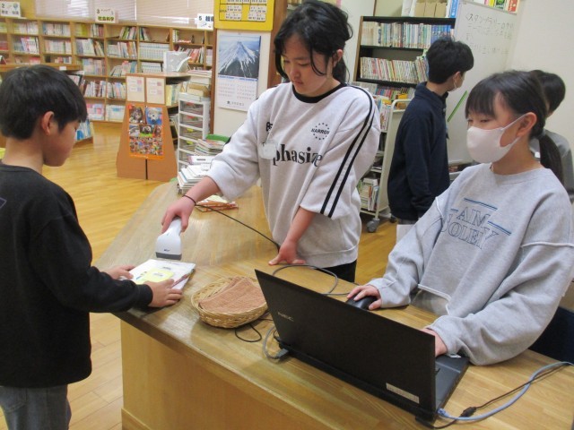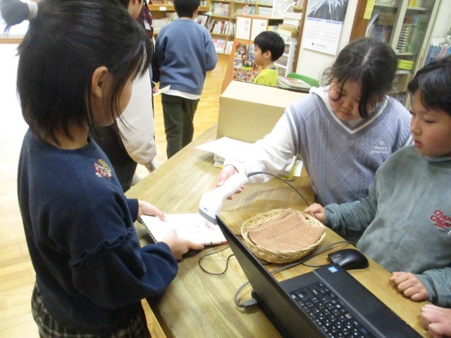 2学期に図書委員会が行った図書スタンプラリーでゴールに達成した人が、本の貸し出しの仕事を体験しました。今週は、5年生、3年生、2年生が、貸し出しカウンターに入り、バーコードリーダーを使って貸し出しや返却の記録をしました。「思ったより簡単にできたよ。」「楽したったよ。」とうれしそうでした。