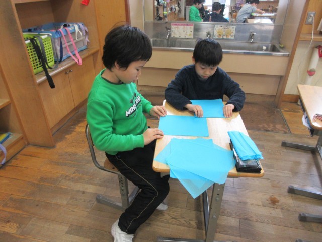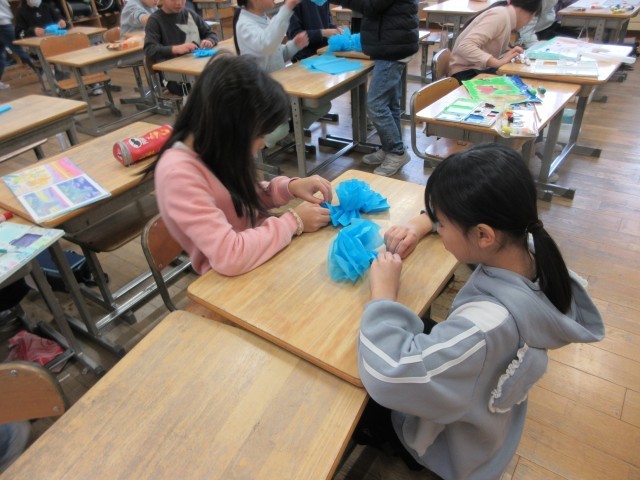 3年生が花紙で飾りを作っていました。きれいな花になるよう、友達と見合ってアドバイスをしている姿が素敵でした。