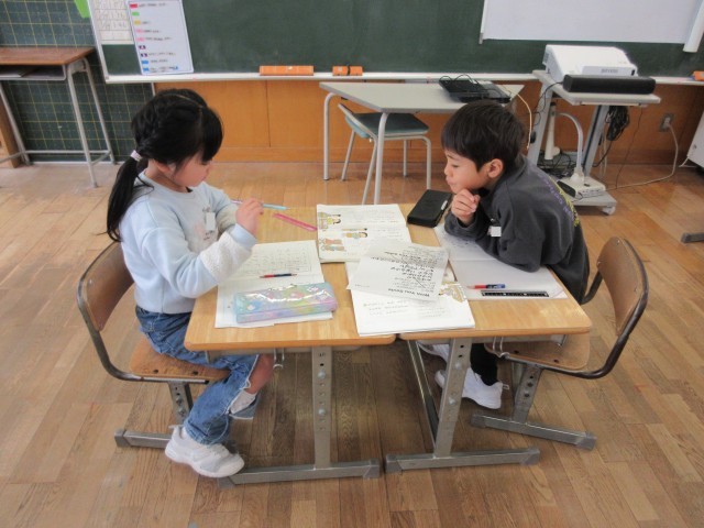 ペアで「これはなんでしょう」の問題を考えています。形や色、特徴を話し合い、どんなヒントを出そうか相談しました。