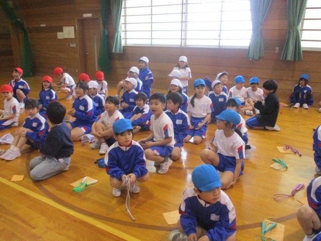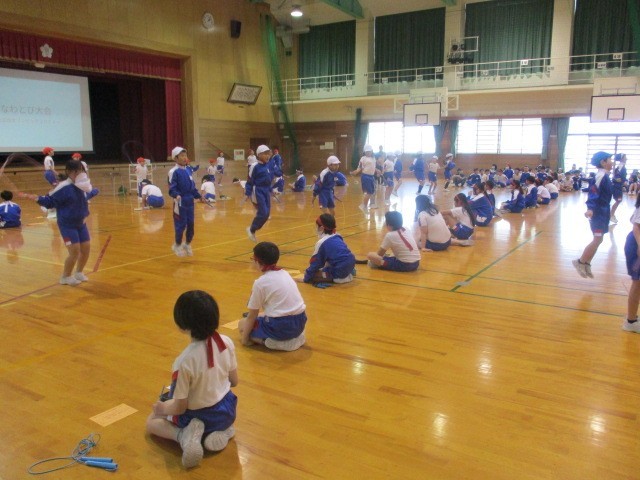 今日はなわとび大会でした。短いなわとびで20回連続跳び、各団ごとに大縄跳びと、練習してきた成果を出しました。