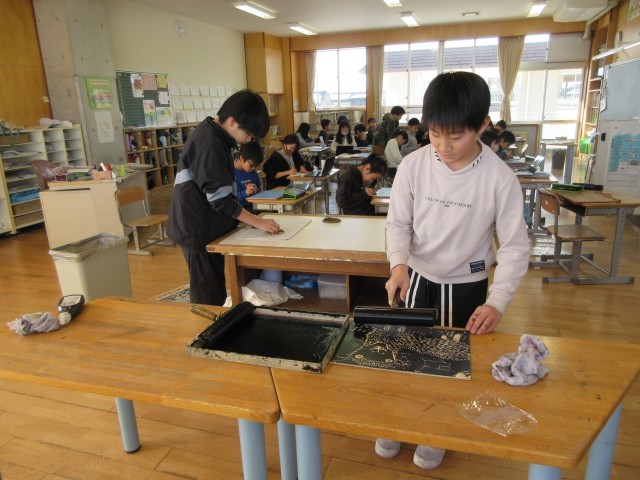 いよいよ版画製作も終わりに近づいてきました。インクの付け方や小棒書の置き方を確認し、順番に印刷しました。