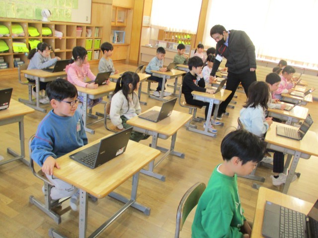クロムブックの使い方にずいぶん慣れてきたので、ICT支援員さんに手書きで文字の入力ができる方法を教えてもらいました。話をしっかり聞いたり、映し出された画面をよく見て確認したりしながら、自分でできるようになりました。約束を守って、クロムブックを大切に使っている1年生です。
