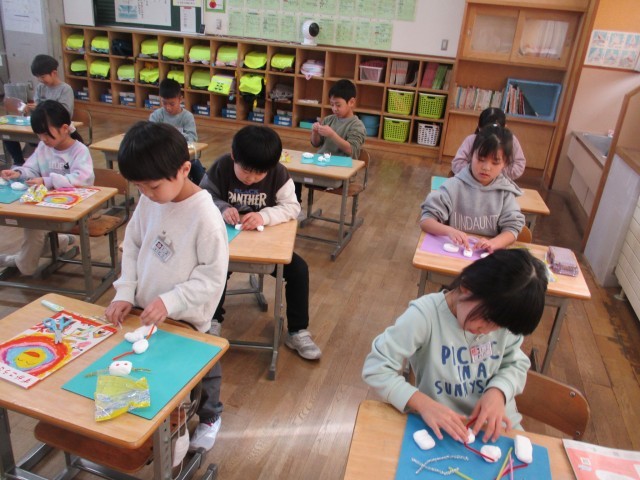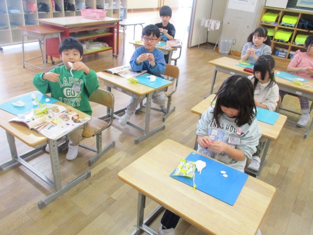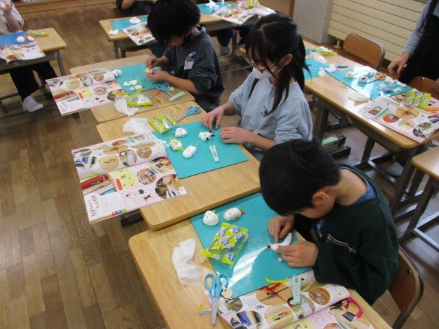 図画工作では、ちょっとした隙間にいたらいいなと思う「すきまちゃん」を紙粘土で作りました。ビーズやモールを使って顔をつくったり、飾りを付けたりして、自分だけの「すきまちゃん」ができました。今度は、隙間にいる「すきまちゃん」の写真撮影に挑戦します。