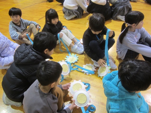 1年生は、入場してくる6年生に首飾りのプレゼントをするために準備をしています。