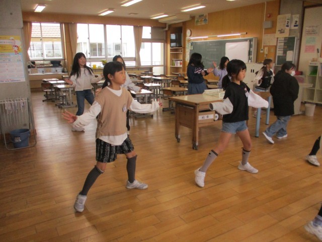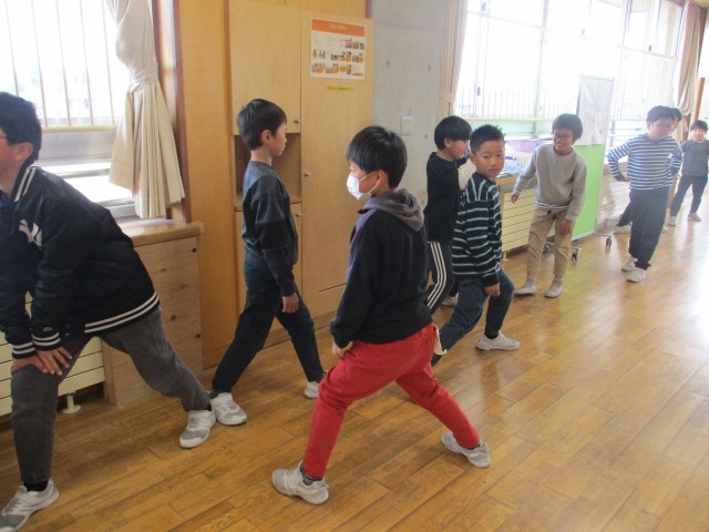 あいにくの天候やグラウンドの状態が悪いことが重なって、校内で体力つくりをしています。「おおひろたいそう」でかたまった身体をストレッチできました。