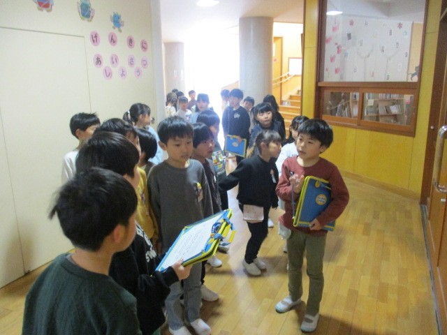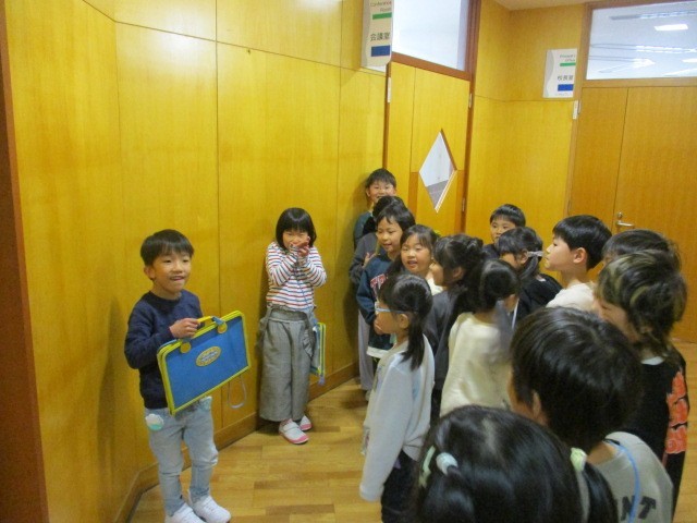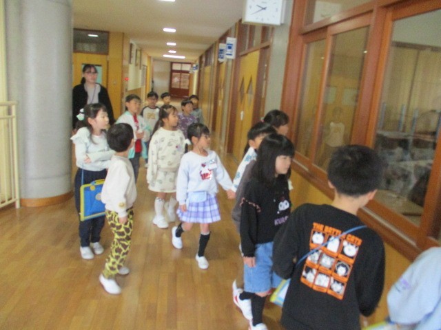 2年生は、1年生と早く仲良くなりたいなと、学校の中を案内しました。「ここは、図書室です。本を借りて読むことができます。」などといくつかの場所を紹介しました。また、いろいろな活動をいっしょにしたいという思いをもちました。