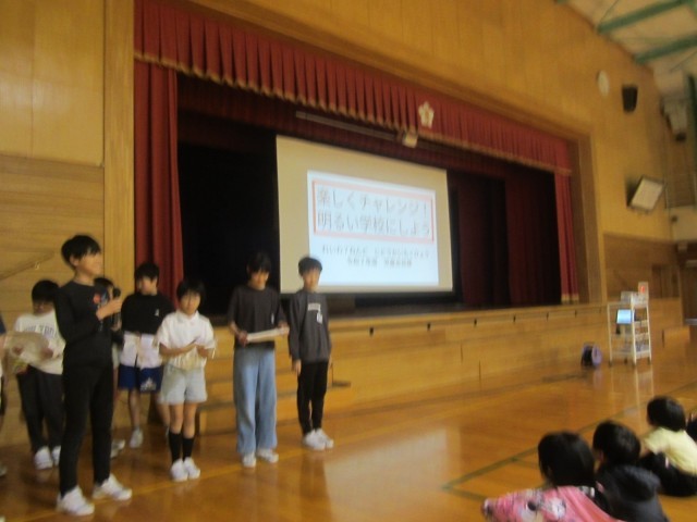 また、創校記念式のあと、児童会の発足式もありました。今年の児童会のスローガンを確かめるとともに、各委員会の委員長が、これからの取り組みについて説明しました。話す子供たちも、聞いている子供たちも、とても落ち着いていて、これからの活動が楽しみになりました。