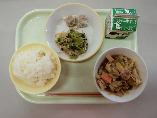 今日の献立は、ごはん、牛乳、肉シューマイ、香味和え、回鍋肉です。