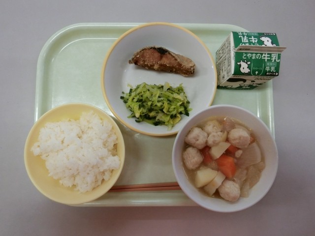 今日の献立は、ごはん、牛乳、あじのからあげ、きざみ和え、和風ポトフです。