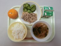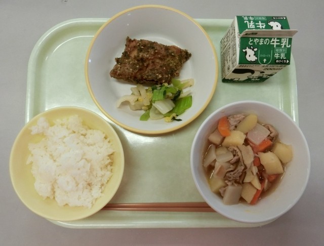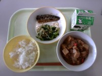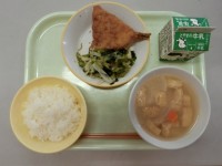 今日の献立は、ごはん、牛乳、ホキのいそべあげ、しょうがひたし、大和煮です。