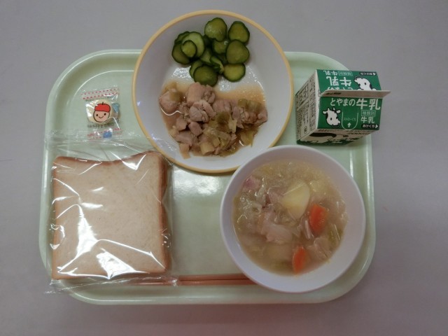 今日の献立は、食パン、牛乳、あっさりチキン、きゅうりもみ、野菜のスープ煮、ポケットチーズです。