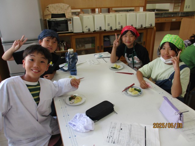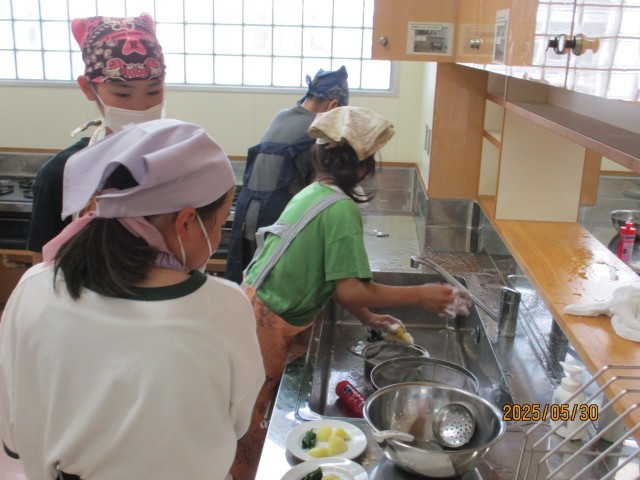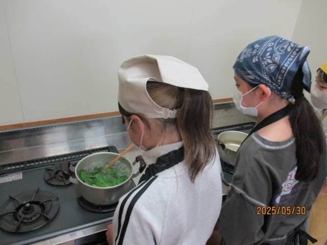 調理実習で、ゆでいもとほうれんそうのおひたしを作りました。本格的な調理実習は、初めてでしたが、包丁の使い方に気を付けたり、協力しながら効率よく片付けをしたりするなど、素敵な姿がたくさん見られました。