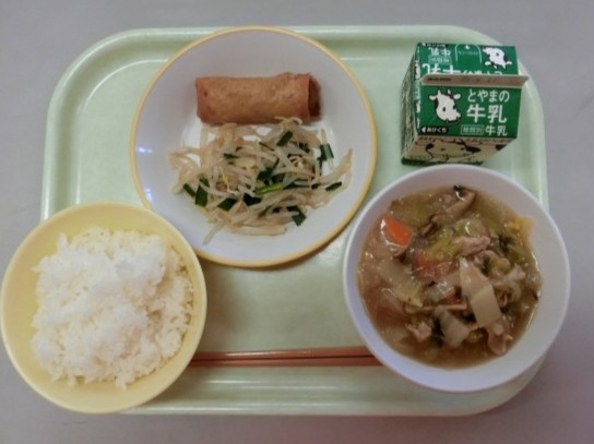 今日の献立は、ごはん、牛乳、春巻き、塩ナムル、八宝菜です。